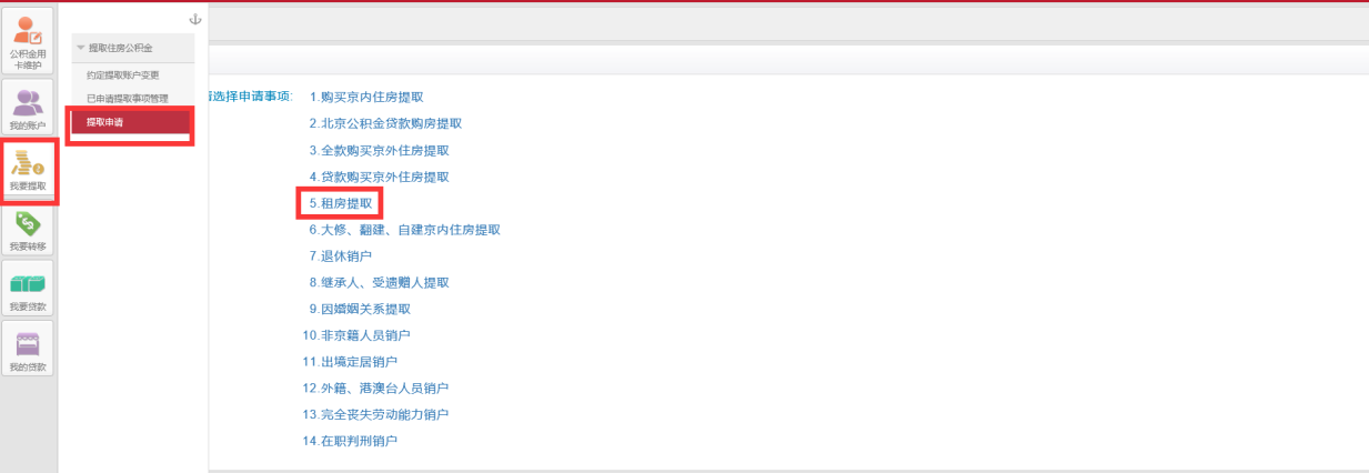 1、进入系统后,在左侧,办理提取处,依次单击"我要提取”-“提取住房公积金”-“提取申请”,选择“非京籍人员销户”