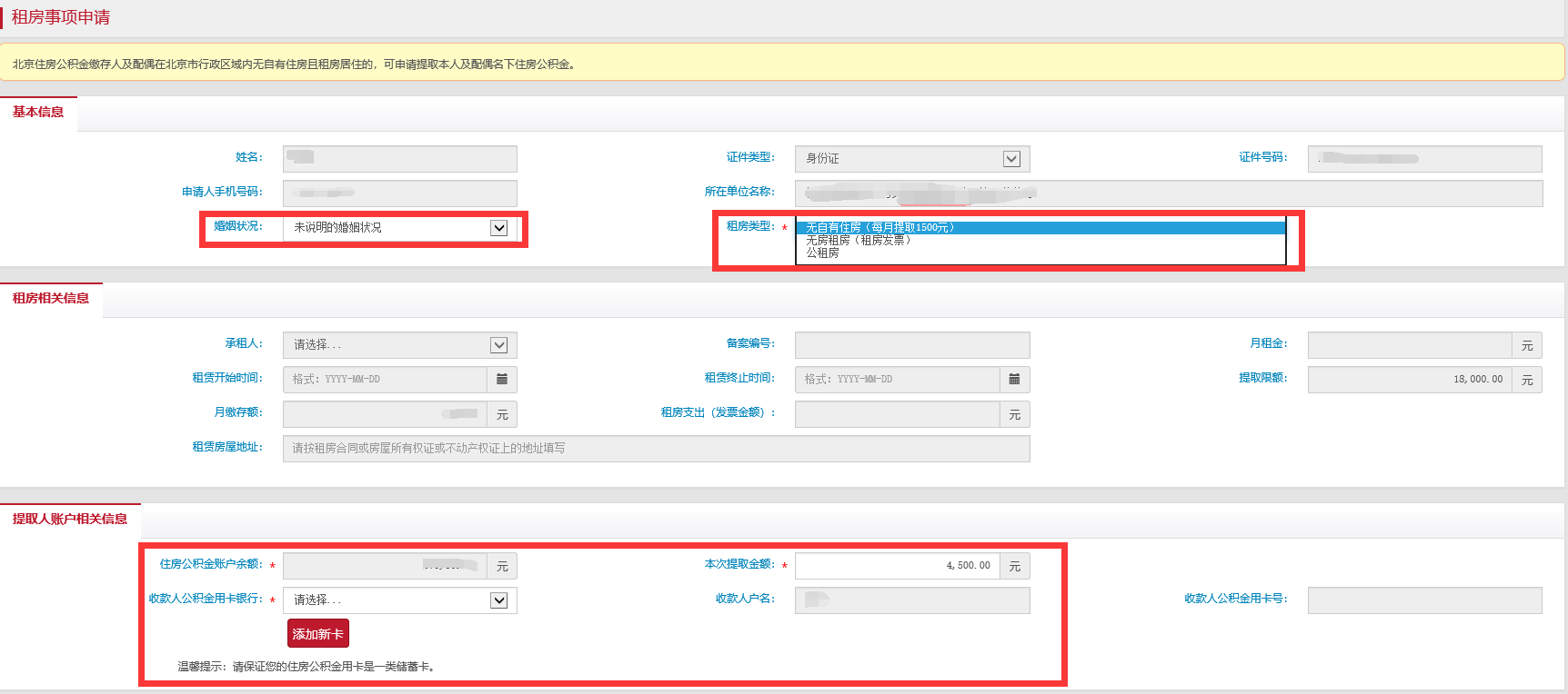 注:如果是超过每月1500元额度的提取,流程基本相同,不同的是需要上传租住商品住房合同原件、租房发票原件照片。